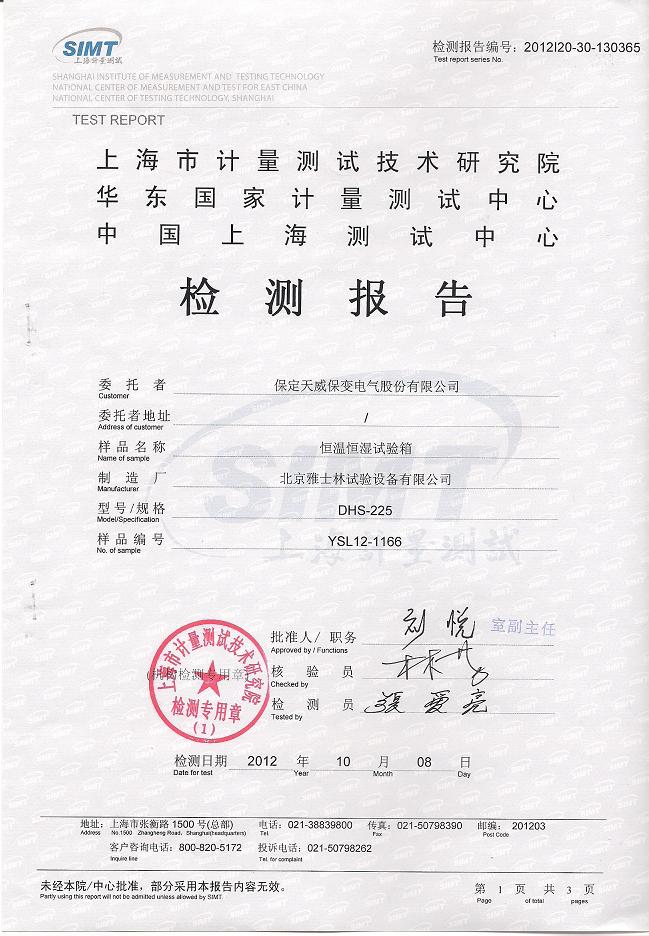 >>恒溫恒濕試驗(yàn)箱檢測(cè)報(bào)告-上海計(jì)量院-天威保變
